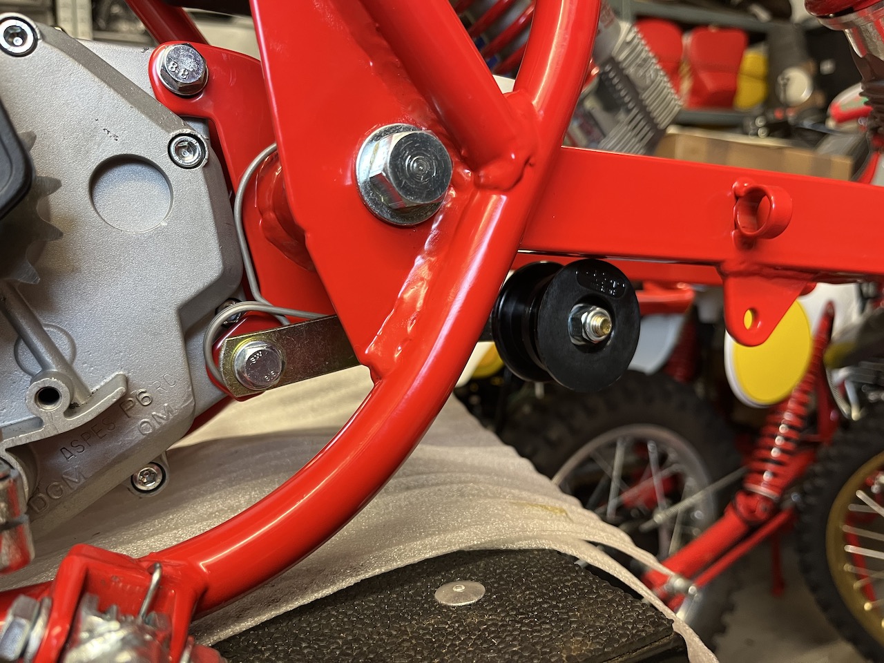Gestern Hochzeit, den revidierten Motor eingehängt, auch den bereits vom Kalle mal erwähnten Kettenspanner aus seiner Jugend -den gibt`s neu beim Horvath- angebracht.