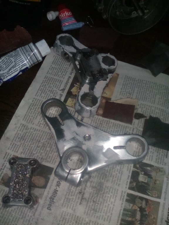 ich hab gestern mal die Gabelbrücken meiner stark ramponierten CS75 in Angriff genommen. Eigentlich wollte ich sie wie original schön blank polieren, aber nach dem entfernen der alten aufgepinselten schwarzen Farbe sind zwei von zahlreichen Hammerschlägen stark malträtierte Teile zum Vorschein gekommen. Die untere Brücke wäre ziemlich ok, aber die obere ist unmöglich blank und schön zu restaurieren. Also hab ich die Macken glatt gefeilt, geschliffen und gespachtelt. Dann werden sie halt doch lackiert, helles silber, dann kommt es dem original einigermaßen nahe.