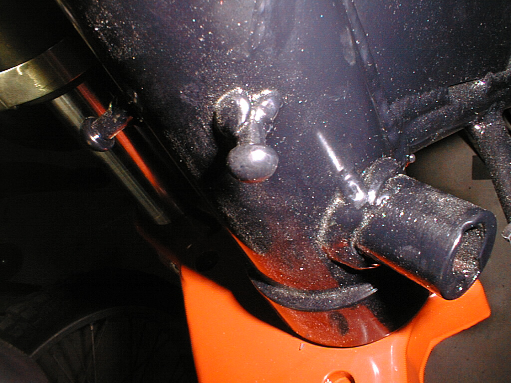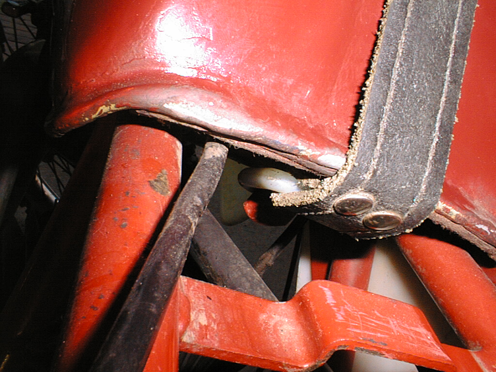 Vorne wird das Ganze über einen Gummi gemacht, diesen gibt es heute noch so an GASGAS EC 250 (Modell 2000 auf jeden Fall) als Tankbefestigung.
