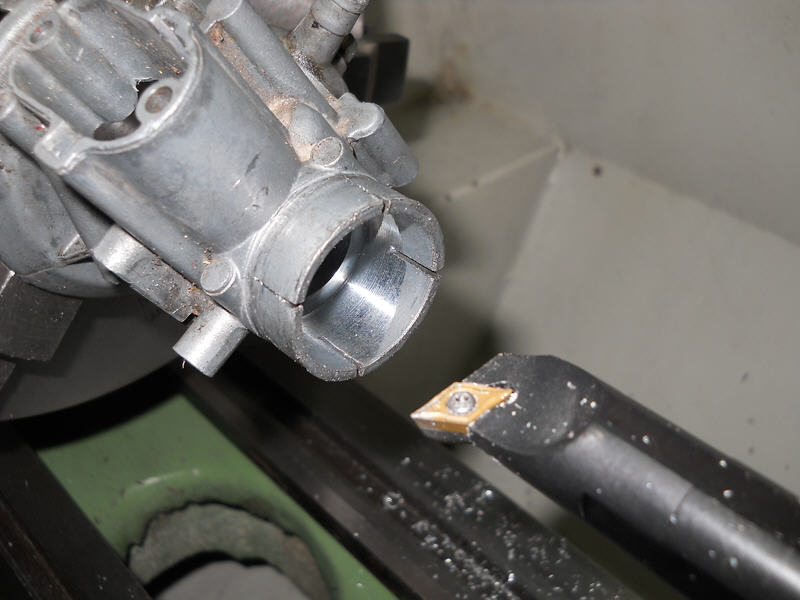 Also ab damit auf die Drehbank! Da die Mittelachse von Ansaugstutzen und Luftfilterseite perfekt fluchteten, ging das schnell im Dreibackenfutter. Sonst hatte man das einzeln verstellbare Vierbackenfutter nehmen müssen.