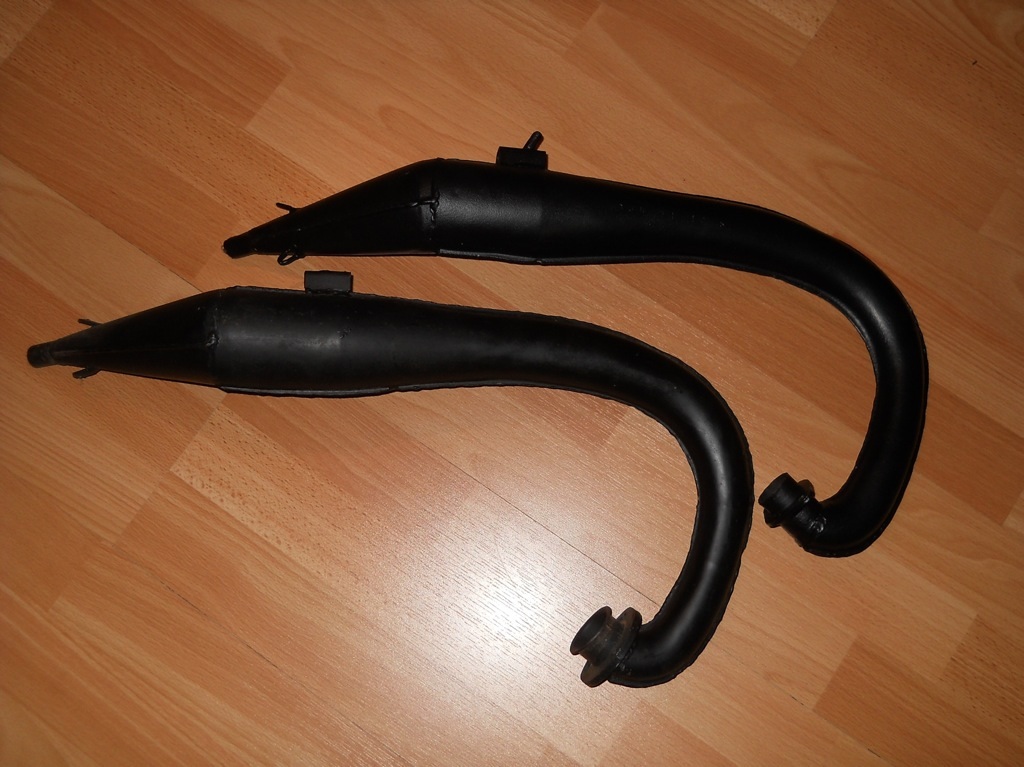 Die mit 2 Befestigungschrauben für die Aspes eigenen Zylinder und die mit 3 Befestigungsschrauben für die ältern Modelle mit "Standard" Minarelli Compact System Zylindern. Mit diesem Krümmer könnte man auch sauber einen 80ccm Motor/Zylinder in einer Doppelschleifen 50er Navaho betreiben.