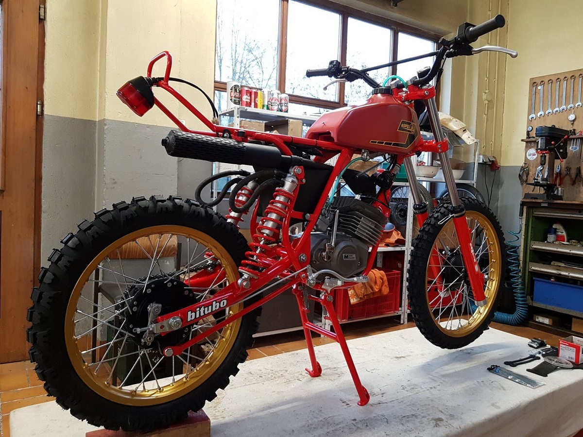 Das ganze Moped sieht übrigens so aus, hat über 30 Jahre in einem Wiener Schaufenster gestanden und Null Betriebsstunden drauf