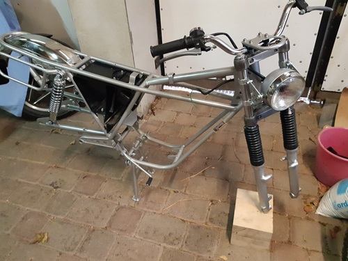 Bad Hersfeld und der 3 LMM stehen wieder auf dem Programm für kommendes Jahr. Die Teile für den P4 der GT4 hab ich ja schon lange von Graf Motoren zurück. Aber in der GT steckt ja jetzt ein giftiger P6, ist aber noch nicht gelaufen. Zu viele Überstunden, zu viel anderes Zeug. Egal, ich brauch für die Tour ein Moped. Also hab ich mal die zweite GT4 in Angriff genommen. Hatte viele Teile, also das Übliche. Komplettieren, strahlen, pulvern etc.. Die Federgabel war Schrott, also musste wieder was von Aliexpress her. Musste nur den Achsdurchmesser und den Haltenocken für die Bremsankerplatte anpassen. Die soll wohl an eine Suzuki 125 passen. Aber den Suzuki Schriftzug muß ich überkleben. Ich muß mit der Kleinen zum Tüv, Papiere machen lassen. Und der Schriftzug stinkt nach chinesischer Produktion