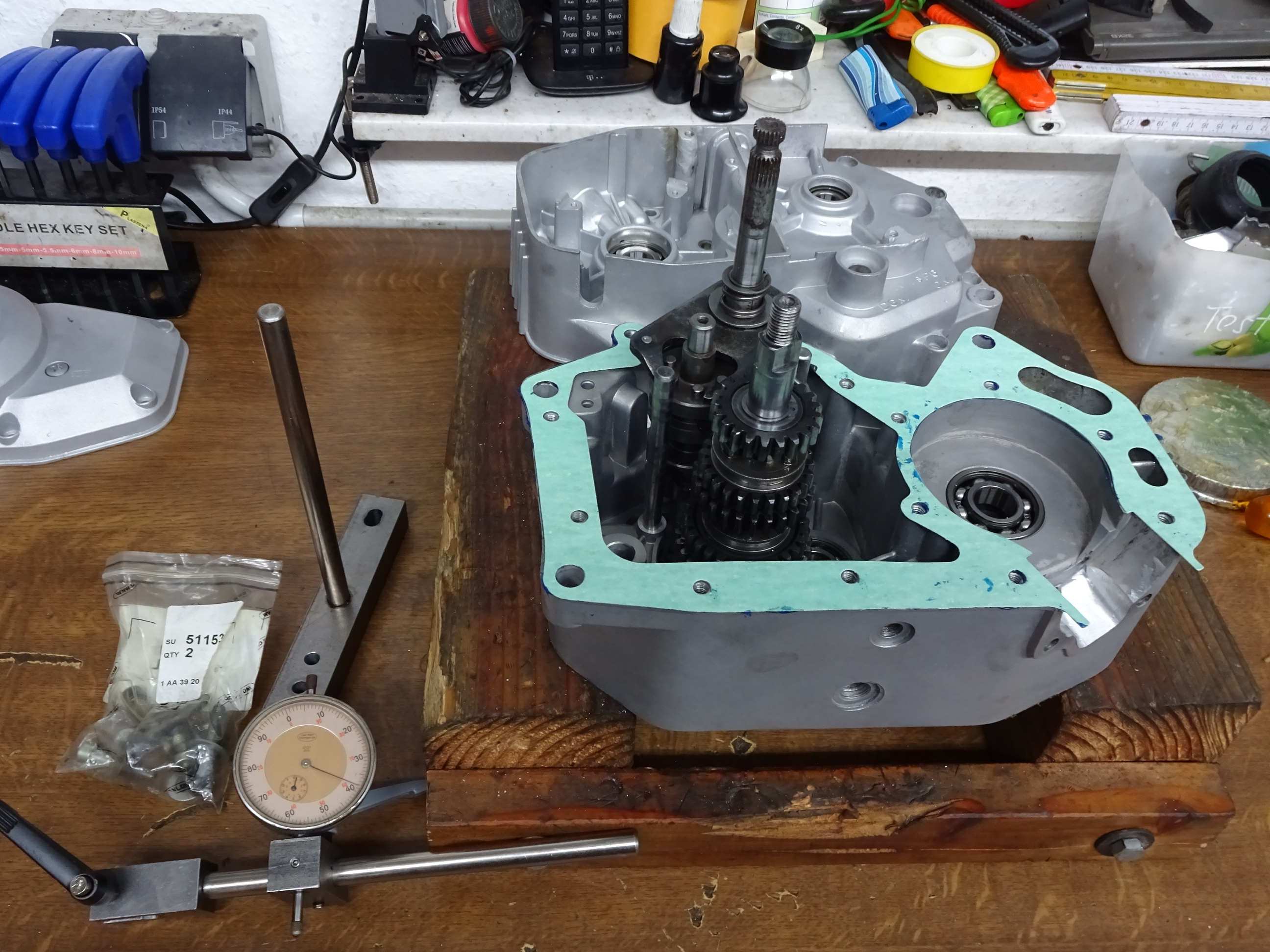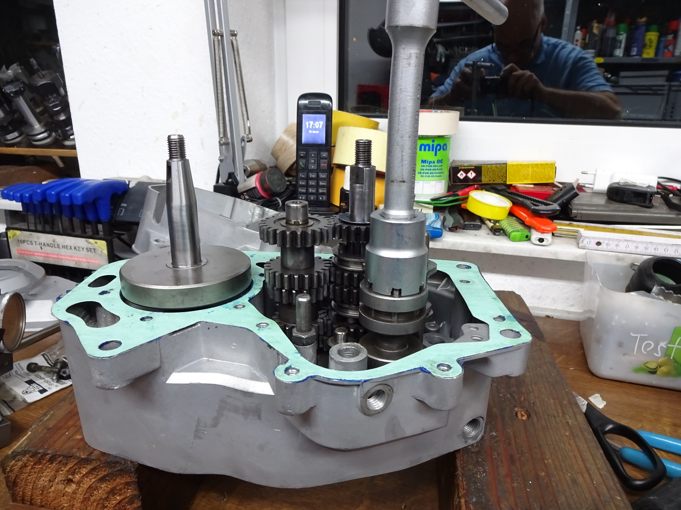 Die Getriebewelle hatte ohne irgendeine Scheibe 0,7mm Spiel, nach dem Ausgleichen 0,1mm. Ich musste aber noch mal messen und ausgleichen, manchmal klappt es nicht in einen Anlauf