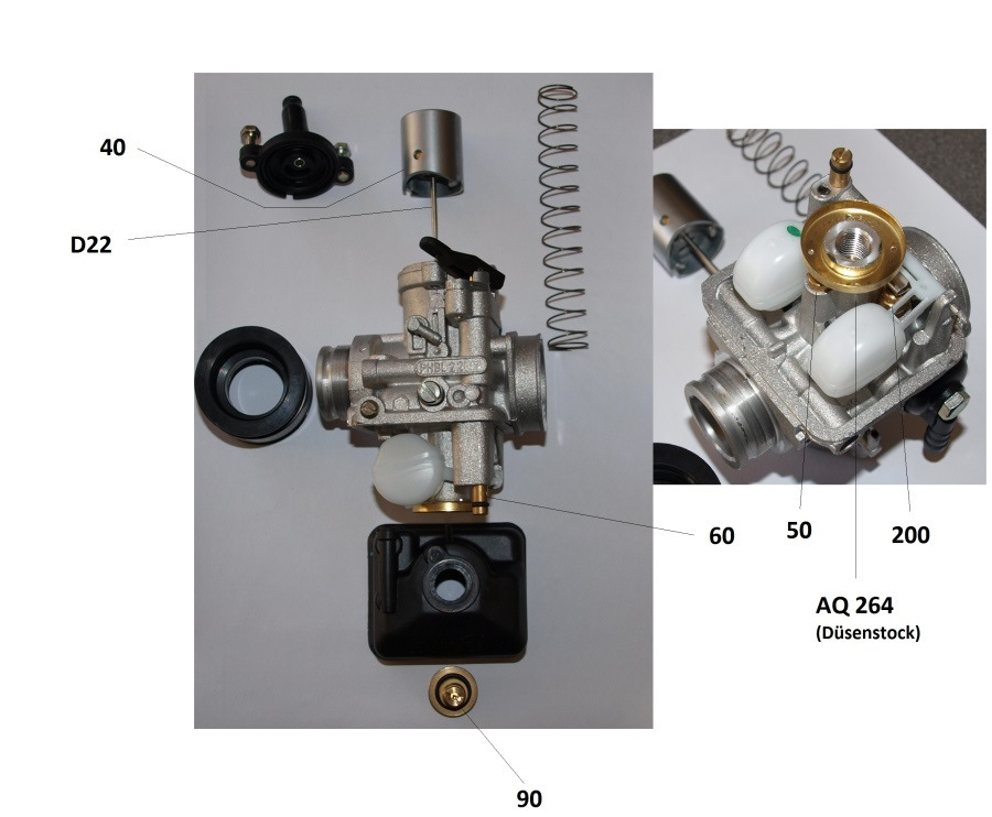 ich habe nach Empfehlung von Rainer (zur moderaten Leistungssteigerung) mir einen 22 PHBL - Vergaser + Ansauggummi beschafft sowie die passenden Anschlußflansche dazu angefertigt. So wie Rainer es beschrieb, hat sich der Durchzug verbessert. Was sich hingegen verschlechtert hat ist das Startverhalten, wenn der Motor warm ist. Auch zu bemängeln wäre, dass im unteren Drehzahlbereich, wenn der Motor eine gewisse Zeit im Standgas läuft, dieser vor dem Anfahren erst mal vorsichtig mit mäßig Drehzahl angehoben werden muss, da sonst die Gefahr besteht, dass der Motor abstirbt. Noch zu erwähnen wäre, dass über die Überläufe des Vergasers von Zeit zu Zeit Benzin austritt, so dass teilweise unter dem Moped eine kleine Lache entsteht. Da meine Versuche den Vergaser richtig einzustellen gescheitert sind, könnte es vielleicht sein, dass die Nebendüse zu groß sein könnte und somit das Gemisch im Teillastbereich zu "Fett" ist?! Die Verbaute Hauptdüse (HD 90) für den Volllastbereich müsste passen. Ich habe noch ein Bild angehängt mit den verbauten Komponenten im Vergaser. Vielleicht hatte ja jemand gleiche Probleme und könnte mir aus seiner Erfahrung heraus helfen?