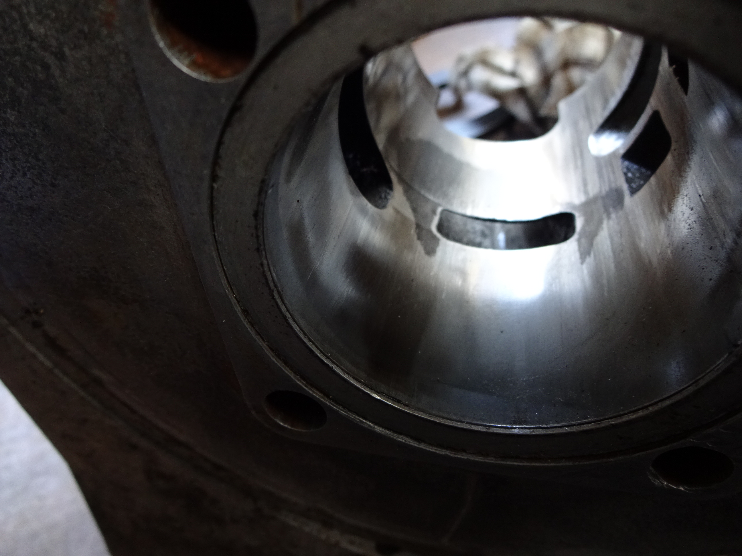 Der Zylinder hat es hinter sich, Einhakspuren an den Kanälen und großflächig Chrom verschlissen. Muss neu beschichtet werden mit neuem Kolben.