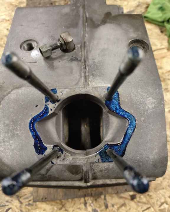 Hallo Kalle, vielen Dank für die schnelle Hilfestellung Die Nadellager waren dank deines Tips mit einem kleinen Gleithammer und etwas Hitze schnell ausgebaut. Dateianhang: Im Nachgang habe ich mich dann mit Luftschleifer und Proxxon Dremel bewaffnet und wollte dem Gehäuse an den Leib. Schnell den Polini Zylinder ausgepackt, etwas Tuschierfarbe drauf und huch... Dateianhang: Dateianhang: Dateianhang: Das Gehäuse hat von Werk aus große Überströmer. Luftschleifer wieder weg und anschließend noch die Stehbolzen ausgedreht. Dateianhang: Gewinde sind bereits nachgeschnitten. Die angesprochene Hülse für die Feder&Kugel ist gerissen, gibt es hierfür Austausch? Kalle, wo beziehst du deine Abstimm- / Ausgleichsscheiben her? Hier werde ich ja "einiges" brauchen. Dichtringe muss ich ebenfalls noch besorgen. Liebe Grüße Andy |