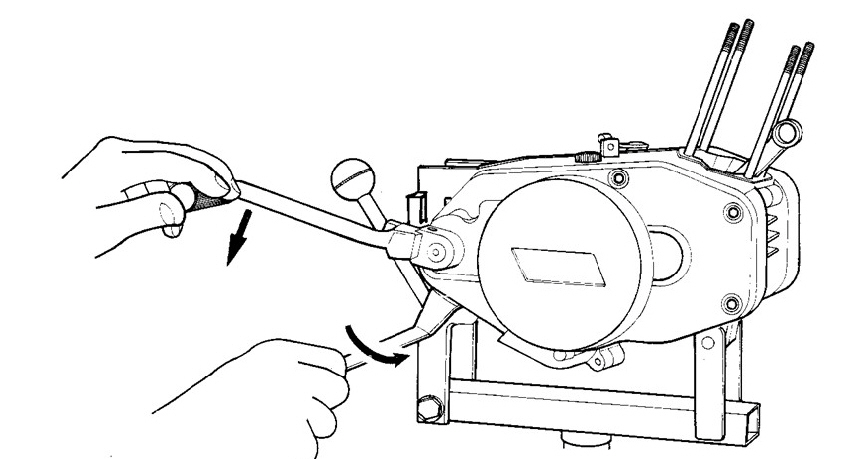 Nachdem dann alles zusammengeschraubt ist, wird die Arretierschraube für den Kickstarter gelöst und der Kickstarter einmal von ganz oben nach ganz unten bewegt und in der Position gehalten. Jetzt die Arretierschraube wieder rein und die Vorspannung passt da jetzt das Zahnrad (unter Spannung) von der Arretierschraube gehalten wird.