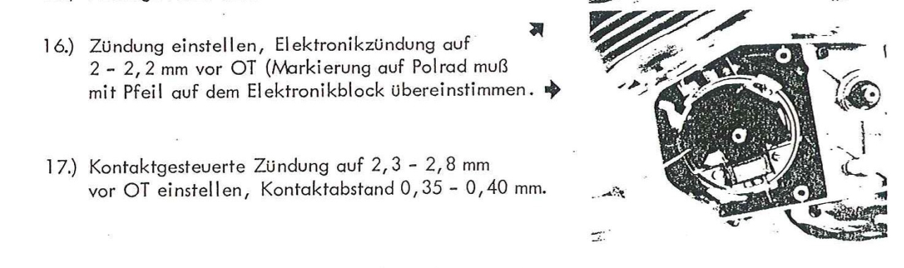 Ist es eine Kontaktzündung muss die Grundplatte soweit verdreht werden, das der Kontakt genau an der Zünd (nicht OT) Markierung öffnet.