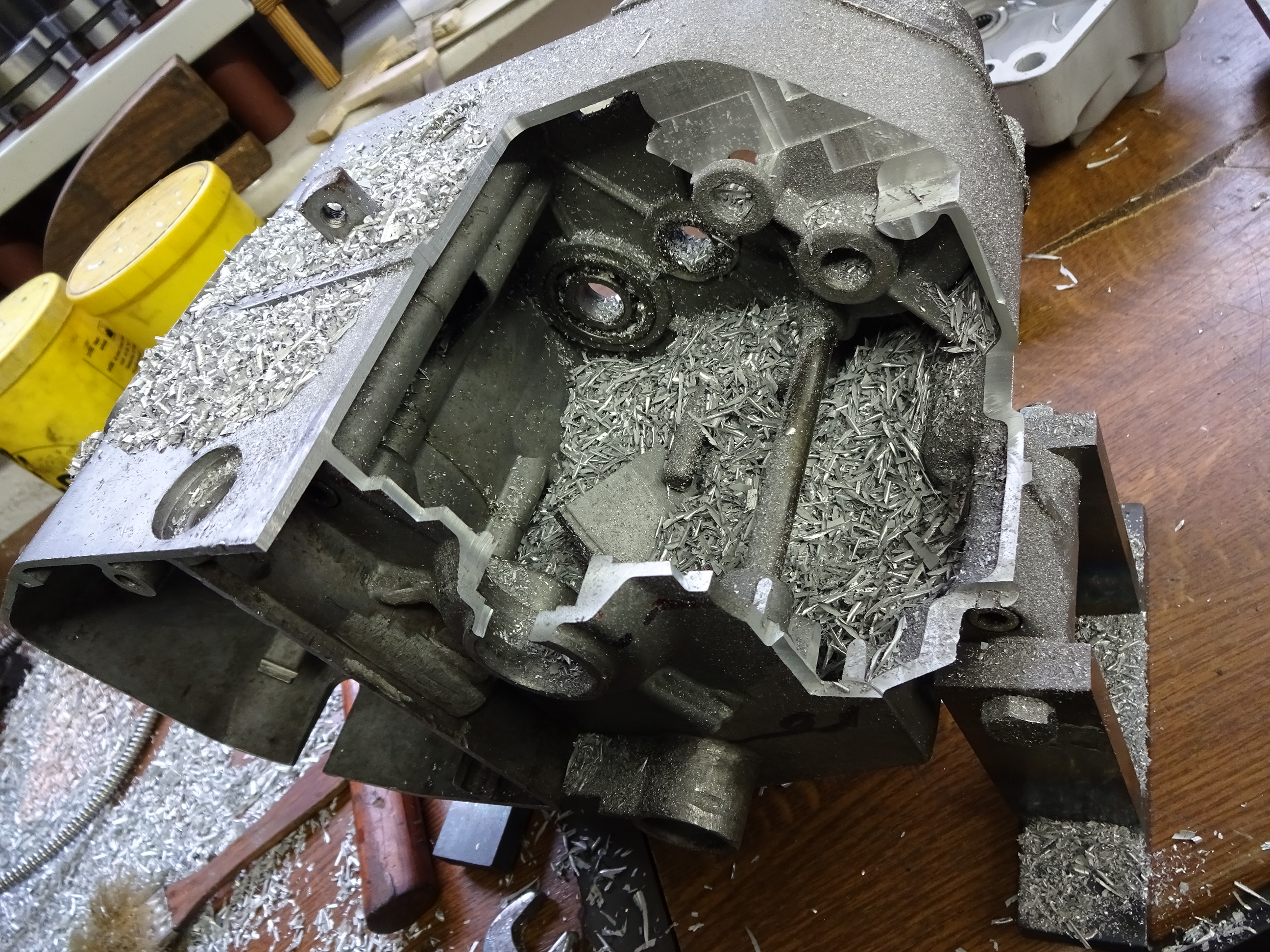 Nachdem das Gehäuse schon mal etwas Luft bekam, hab ich mir den Zylinder vorgenommen. Konnte mit dem überlangen 6mm Fräser nur in 2mm Zustellschritten arbeiten, aber es ging.