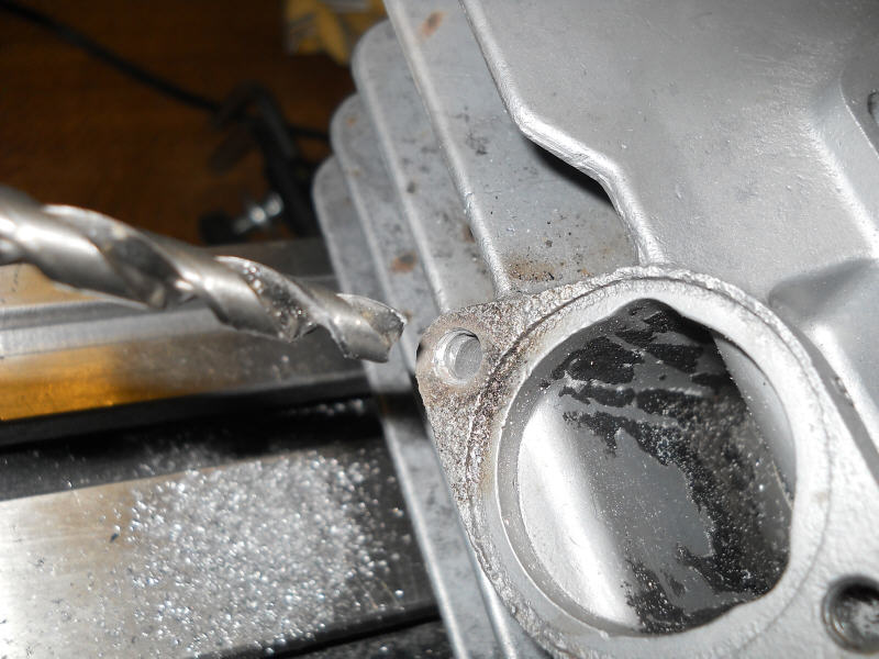Die meiste Arbeit geht beim Ausrichten drauf. Hierzu hab ich einfach eine M6 Schraube "entköpft" und ins funktionierende andere Gewinde geschraubt. Dazu den Kopf meiner Främaschine geschwenkt und zwar so, dass das Bohrfutter beim Pinolenhub sauber über die EX-Schraube geht.