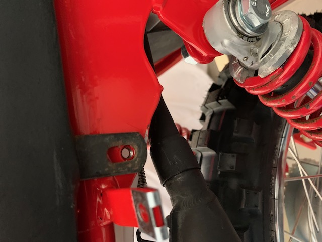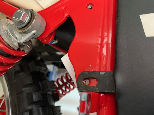 Irgendwie ließ mir die nicht passende kurze Sitzbank keine Ruhe, Seitendeckel abgeschraubt und die Bank nochmals draufgesteckt. Auf einmal sehe ich da in Höhe der Sitzbanklasche am Rahmen ein Gewinde, gegenüber auch, die Bohrung mit Gewinde entspricht der Befestigungsstelle für die kurze Sitzbank!!! Ich Depp, vor Jahren schon mal bei der schwarzen Cimatti versucht, nicht gecheckt!!! Sollte an sich logisch sein, dass die kurze Sitzbank passen muss, die Rahmen waren ja für alle gleich -Mofa, Mockick, 80er-.