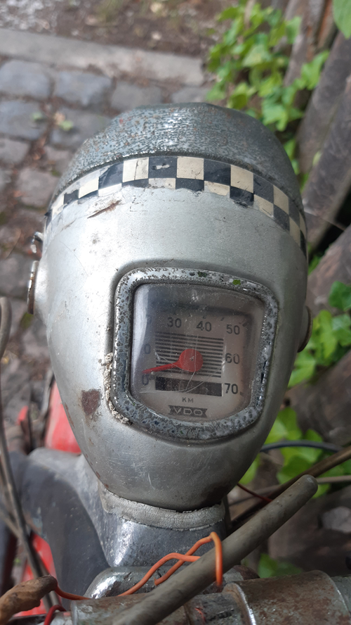 Der Auspuff hat eine Art Klappensteuerung. Vom unteren Rahmenrohr geht ein Seilzug in den Endtopf und verschiebt da irgendwas. Muß ich noch analysieren. Eine schmucke Lampenverkleidung gehört da auch dran, im Stil der Cafe Racer. Fehlt auch, aber geht auch erst mal ohne oder man findet aus dem Mopedbereich irgendwas. Das Versicherungskennzeichen ist von 1966, lustig, 9 Jahre vor meiner Geburt