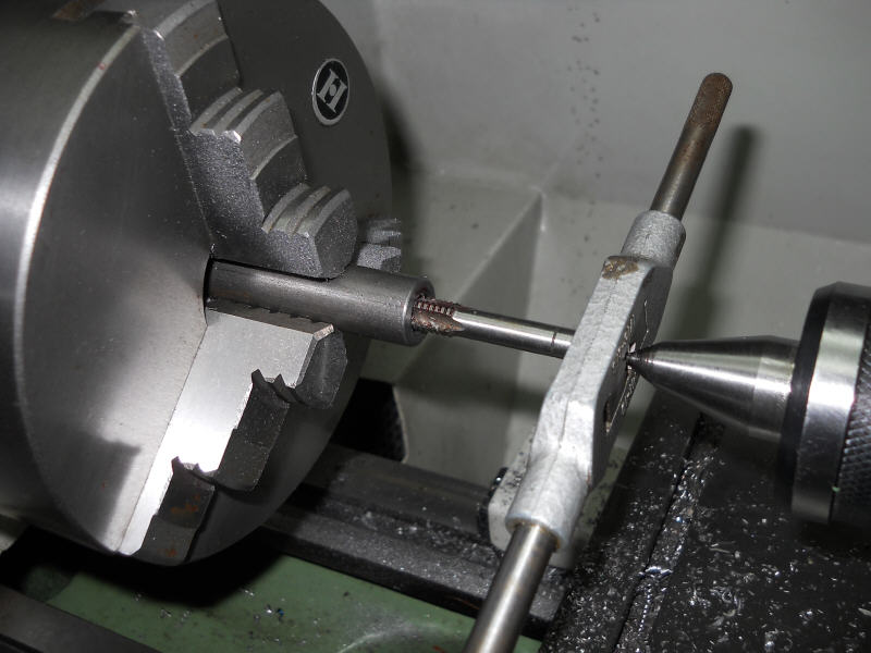 Ab auf die Drehbank mit der Schraube und erst mal das zu große M14 Gewinde auf 8mm abgedreht.