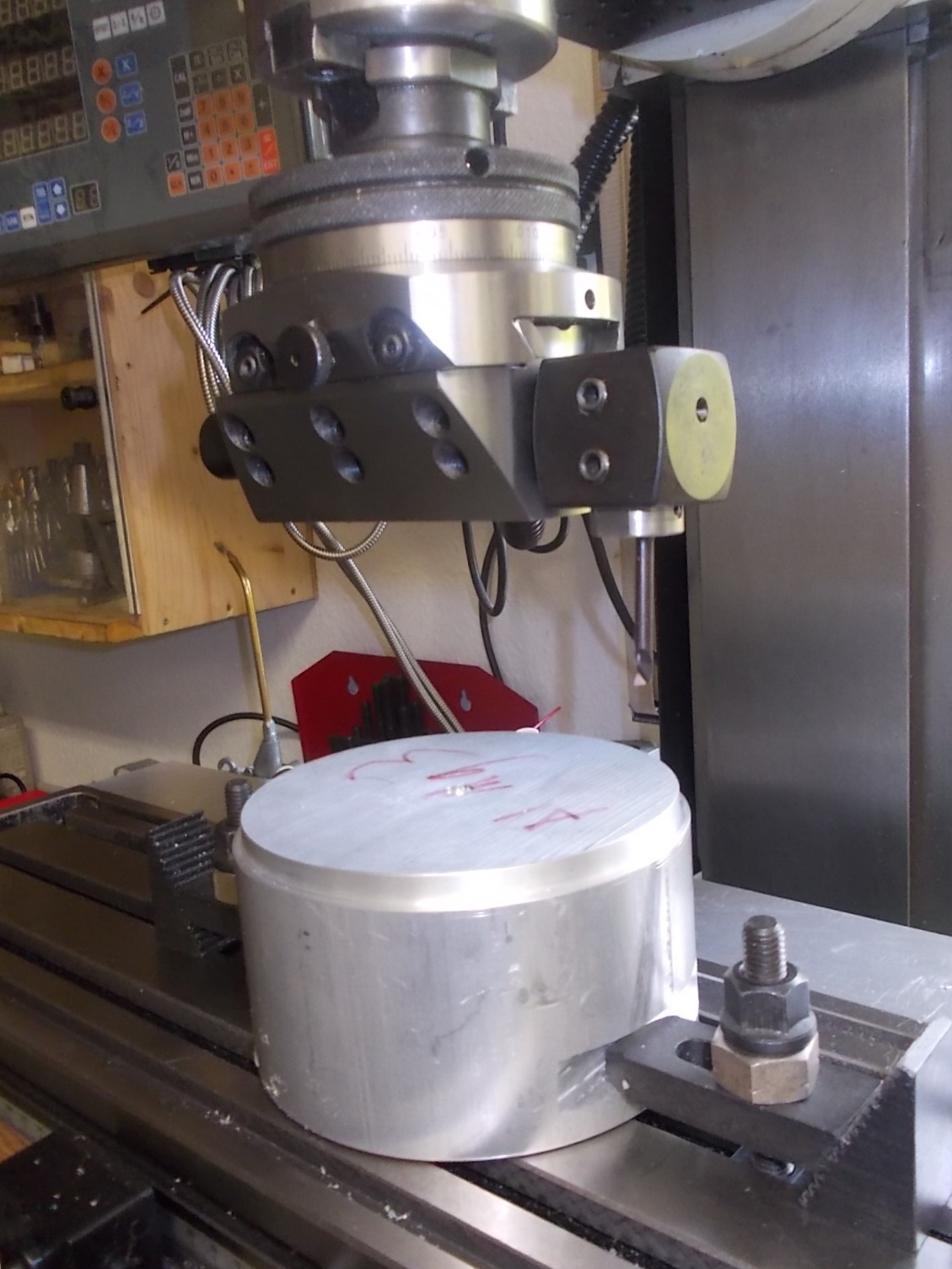 Dann noch Ausbuchtungen eingefräst, damit ich den Klotz auf der Fräse festhalten kann. Da im Klotz auch eine Zentrierbohrung reingemacht wurde, konnte der mittig zentriert unter den Fräskopf ausgerichtet werden. Jetzt den Ausdrehkopf vorsichtig angenähert, so das der Meissel gerade ankratzt.