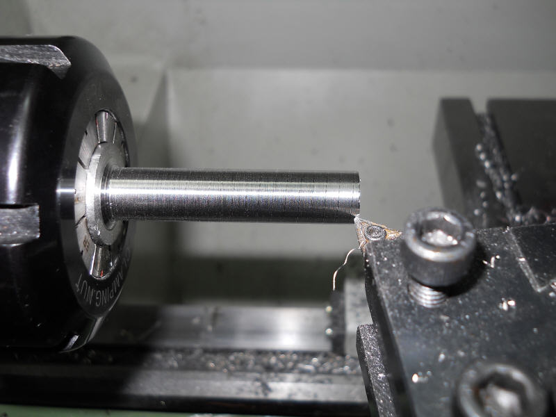 Ab auf die Drehbank mit der Schraube und erst mal das zu große M14 Gewinde auf 8mm abgedreht.