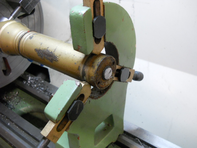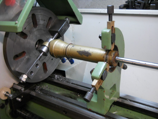 Trotzdem hab ich Bitubos die sich weiterhin weigern ihren Deckel herzugeben (sieht man auf den vorherigen Bildern, da ist noch ein verbogener Stahlstift zu sehen). Da hab ich mir eine Vorrichtung für die Planscheibe meiner Drehbank ausgedacht, wo ich die Federbeinaugen in einstellbaren Kegeln spannen kann. Geführt wird das Federbein dann noch von einer feststehenden Lünette.