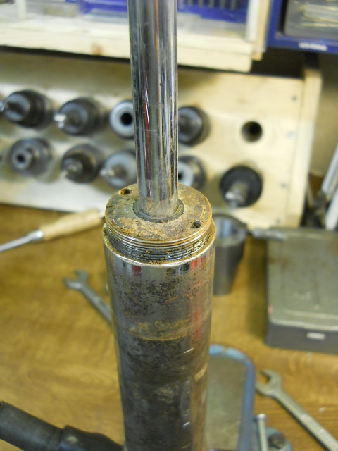 Hier sieht man was ich damit mache. Ich säge die rausgezogene Kolbenstange (eh verrostet) ab und schiebe den Rest zurück. Dann bei niedriger Drehzahl vorsichtig ausgedreht bis kurz vor das Gewinde. Dann kann man das Restgewinde mit nem kleinen Meißel (alter Schraubenzieher