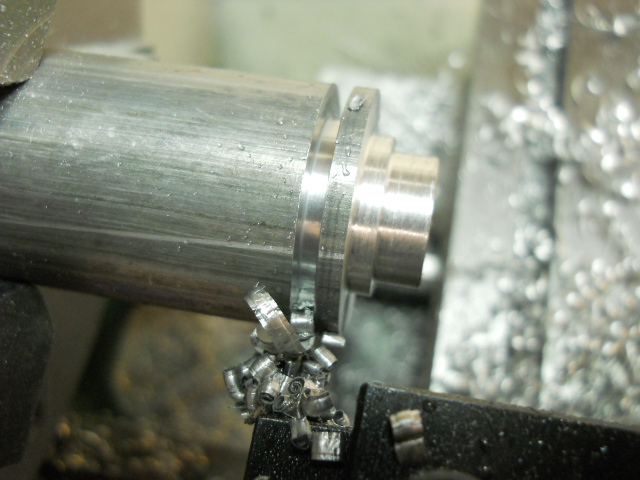Um dann die Federbeinaugen von den Kolbenstangen zu bekommen hab ich mir ein Alumaterial genommen und ne 12mm Bohrung sehr fein gebohrt und mit guter Oberfläche ausgedreht. Das Teil der Länge nach durchgesägt und vorher noch mit Querbohrungen versehen. Das Ganze kommt dann nach dem Festziehen in den Schraubstock.