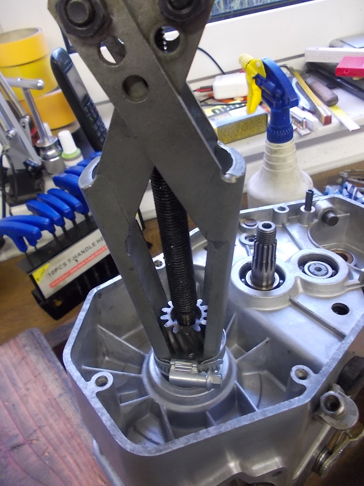 Dann noch ein kleiner Tipp wenn ihr die Getriebeausgangswelle mit der Schaltwalze und den Schaltgabeln einbauen wollt. Einfach zwei Gummis um die Welle und nichts fällt mehr auseinander. So kann man das Ganze ruhig einfädeln und nachher einfach die Gummis zerschneiden und rausziehen.