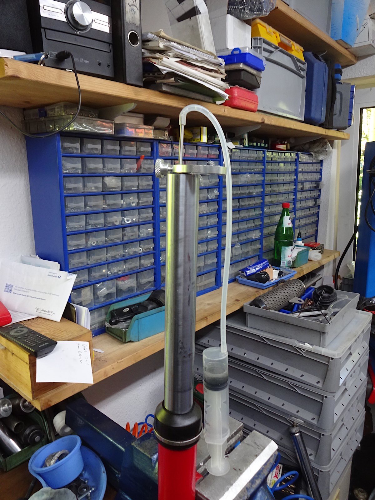 Wenn man jetzt so ein Tool hat, kann man den gewünschten Füllstand einstellen und ganz einfach mit der Spritze absaugen. Einfach und effizient.