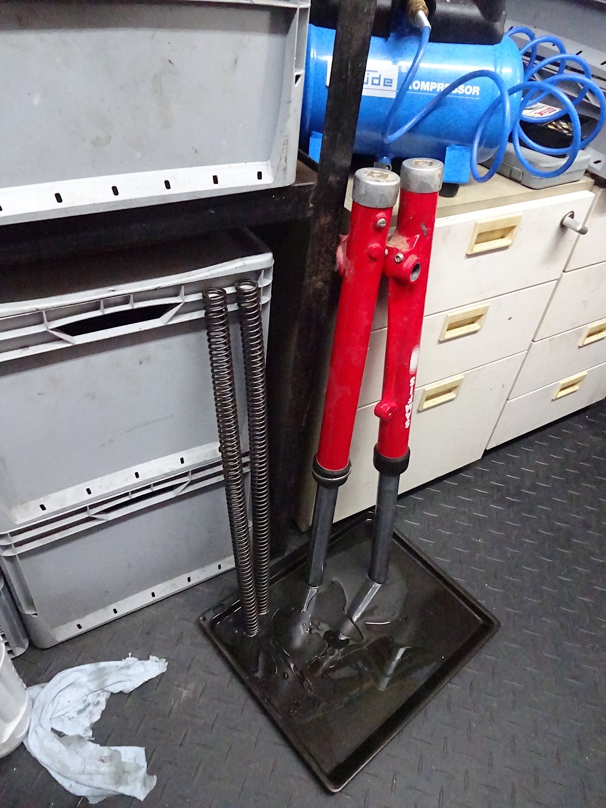 Die Gabelholme können jetzt erst mal schon auslaufen, dann wird zerlegt und gesäubert. Neue Dichtringe sind im Zulauf.