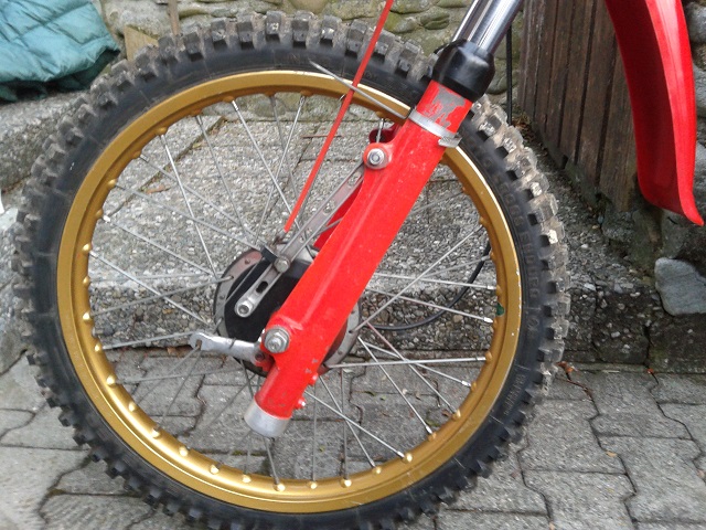 Am Vorderrad ist ein Metzeler Motocross Enduro und am Hinterrad ein Metzeler Motocross aufgezogen, das Profil fast neuwertig ;) , aber mindesten 12 Jahre alt :? . Ich werde Anfang März mal testen, wie sich die Reifen fahren, wäre ja schade um das schöne Profil, bekommt man heute glaube ich auch gar nicht mehr. Wenn ich wieder beim Moped bin, sag´ ich Dir, ob die Reifengrößen stimmen. Weiter unten zwei Bilder zum Abstand, wie weit die Felge nach vorne steht, und ein Bild, wie eng der Abstand zwischen Reifenflanke und Kettenschutz ist.