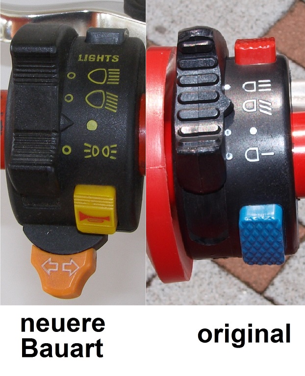 Lichtschalter: An der HRD wurden Lichtschalter von der Fa. Leonelli verbaut. Die Fa. gibt es noch (http://www.leonelli.com/english/control.htm). Der Schalter sieht optisch immer noch so ähnlich aus. Allerdings meine ich, dass beim neuen Schalter beim Aufblenden ebenfalls das Abblendlicht mit an bleibt, was die Lichtmaschine in die Knie zwingt. Als Alternative könntest Du dir ja einen passenden universalen Schalter kaufen. Bei der HRD gibt es ja nur, Abblendlicht, Fernlicht, Hupe und Motor-Aus.