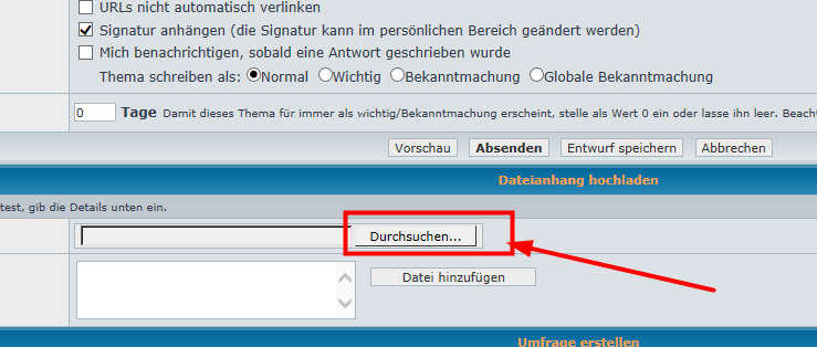 So, da immer wieder die Frage aufkommt wie man Bilder in einen Beitrag bekommt, hier einen quick and dirty Anleitung Wenn ihr einen Beitrag schreibt, habt ihr genau unter dem "Absenden" Button die Möglichkeit eine Datei auf eurem Rechner zu suchen Dateianhang: Sobald ihr die gewünschte Datei ausgewählt habt, steht der Pfad im Fenster drin und ihr könnt die Datei hochladen. Zusätzlich könnt ihr links vom Hinzufügen-Botton noch Text eingeben (Dateikommentar), um dem Bild eine sichtbare Beschreibung mitzugeben. Dateianhang: Jetzt kann es vorkommen, das ihr eine solche Meldung erhalten Dateianhang: Das liegt meist daran, das ihr eine viel zu große Datei hochladen wolltet. Damit Leute mit Smartphone auch noch was erkennen können und mir der Server nicht platzt, habe ich die maximale Größe auf 1600 x 1200 Pixel begrenzt. Ist eure Datei größer, müsst ihr die in einem geeigneten Programm halt entsprechend verkleinern War die Datei korrekt, erscheint der Name direkt unten links unter dem Textfenster und kann dann an der aktuellen Cursorposition im Text eingefügt werden. Dateianhang: Ich hoffe hiermit klappt das mit dem Bilder einfügen. Aber ihr könnt gerne Fragen stellen. Gruß Kalle |