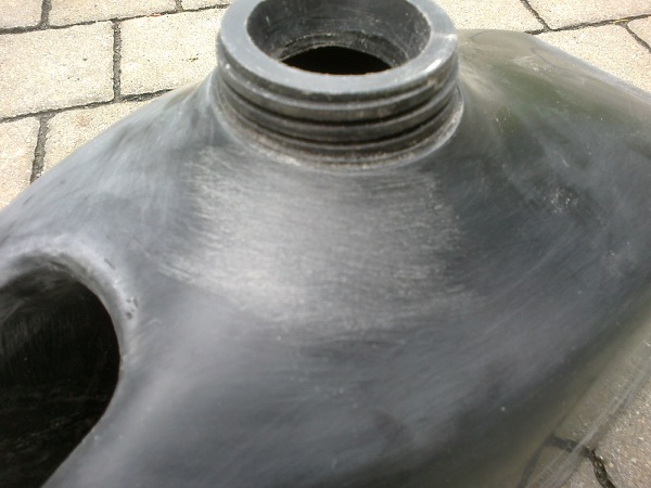 Die Abstufung der Körnung ist das wichtigste, hier mal grob angerissen: erst den Tank mit 400er trocken schleifen, danach die tiefen Kratzer mit 200er ,anschließend die Oberfläche wieder mit 400er wieder auf ein gleichmäßiges Niveau bringen.Jetzt nochmal mit 600er.