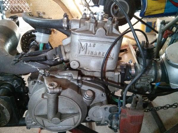 Da der MAC Minarelli auch im Kartsport genutzt wurde, hab ich noch ein Bild eines wohl Membran gesteuerten Motors mit Wasserkühlung gefunden. Hier erkannt man gut den geänderten Kupplungsdeckel für die Wasserpumpe (hier wohl doch ohne). Da ist hier dann die Zündspule befestigt worden.