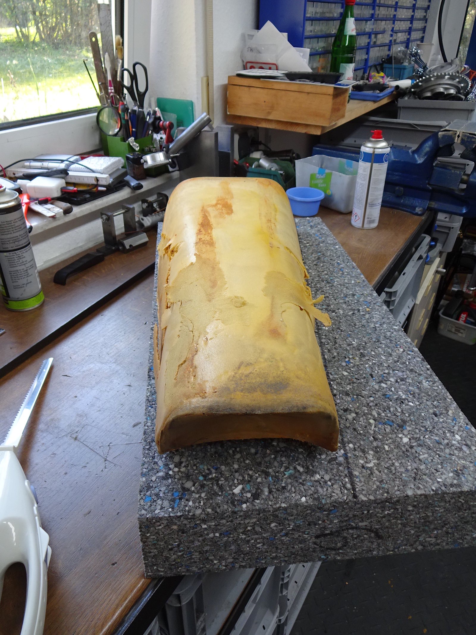 So heute mal losgelegt mit dem Schaumstoff. Alten aufgelegt und ersten Schnitt angezeichnet, das elektrische Küchenmesser war dabei nicht ungeeignet