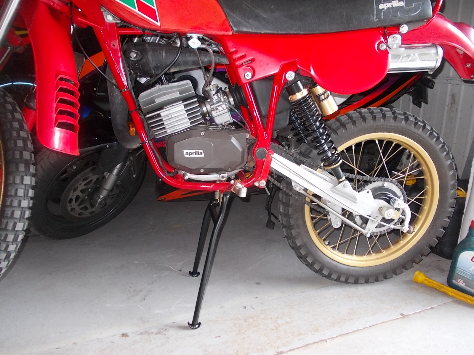 Der Mittelständer ist auch lackiert und die Aprilia steht wie ne 1.