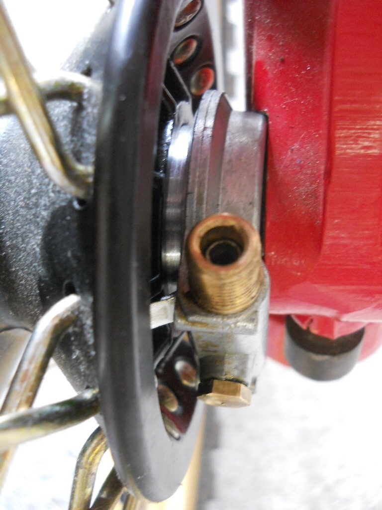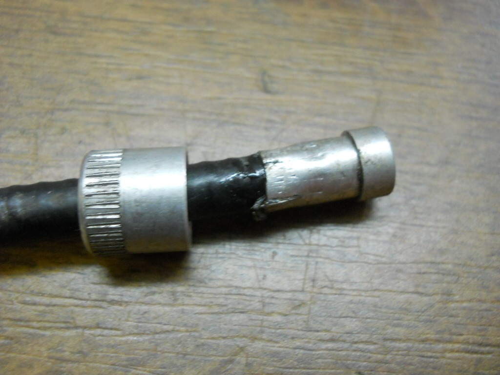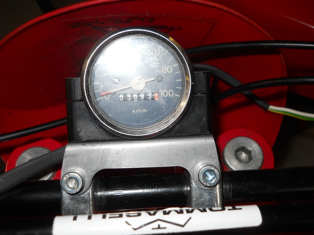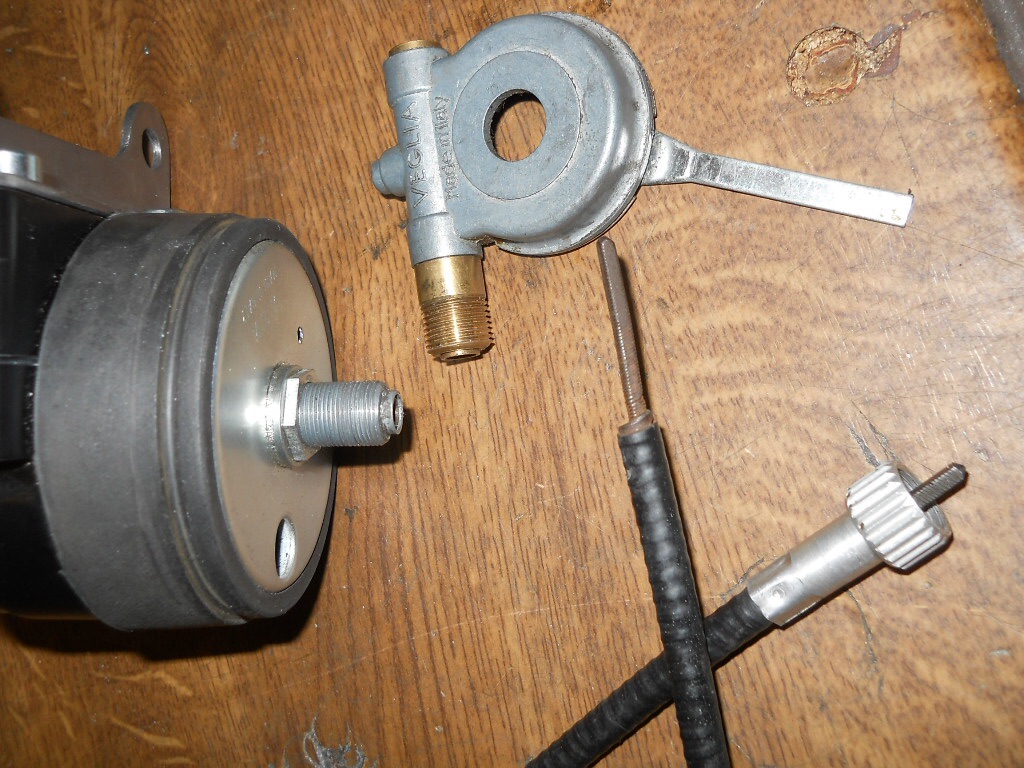 So jetzt hab ich mich an das leidige Tachoantrieb-Thema gemacht. Mein Problem, ich hab weder ne passende Tachowelle noch einen Antrieb der passte. Alles was ich an Antriebe hatte, kam viel zu weit an die Nabe ran, da ging nicht nicht mal die Rändelschraube hin. Das was ich zusammen kramen konnte, war ein CEV Antrieb für den Veglia Tacho und eine zu beiden passende viel zu lange Welle.