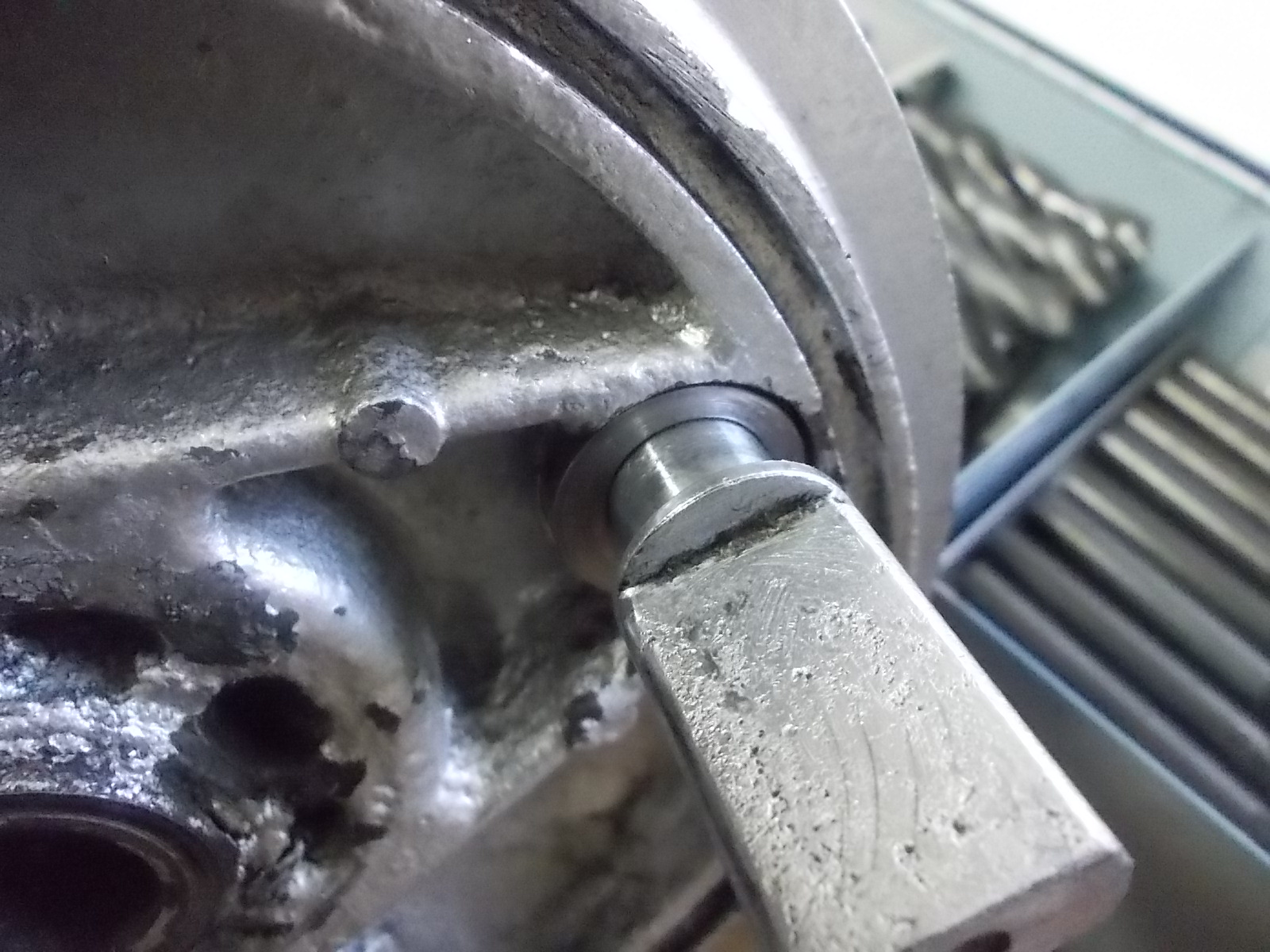 Jetzt kam der schrecklich ausgeleierte Magnesium Bremsdeckel von Hans Joachim an die Reihe. Der musste unter die Fräse und erst mal rund ausgespindelt werden. Um nicht zu viel Material zu entfernen, mussten wir aussermittig arbeiten und dadurch später die Buchse auch aussermittig bohren. Nachdem das Mass für die Buchse feststand, diese mit Bund erst mal gedreht. Da wir uns nicht trauten eine Buchse in einen Magnesiumdeckel zu pressen (Rissgefahr) musste diese erst mal mit Lager und Buchsenkleber eingeklebt werden. Mache das Teil wohl morgen fertig, dann kann ich auch Bilder davon machen.