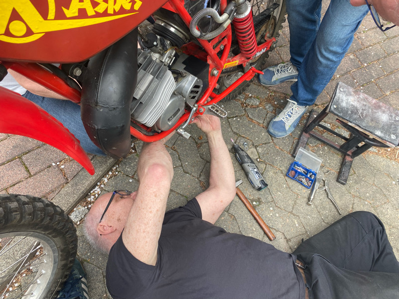 Kalle selbst stellte sicher, dass auch alles ordnungsgemäß passt und warf sich unter mein Moped.