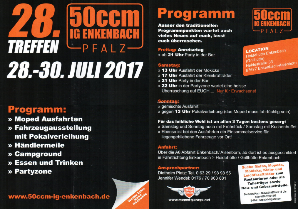 im Juli findet das 28. Mopedtreffen der IG Enkenbach statt. Über die 3 Tage der Veranstaltung ist ein abwechslungsreiches Programm geplant.