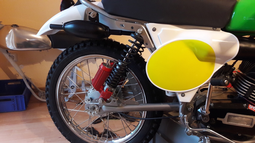Malaguti, alte Liebe. Ich war Ronco-Fahrer, allerdings ist die Cavalcone aus den 70ern die schönste von allen - wie ich finde (hat ein wenig von Ancillotti). Nach den Aspes-Restaurationen habe ich mir meine persönliche Mala zusammengestrickt. Dabei sind Jahre ins Land gezogen. Originalteile gesucht, aber nicht Originalbaujahr und Farbe und Motor. Man möge mir verzeihen. Rahmen BJ 78 mit Ori-Gutachten ohne Vergasereintrag. Schwinge Chopper, BJ81, hatte nichts anderes. Habe ich erst beim Zusammenbau festgestellt. Zu breit – Nase für Bremsanker verlängert. Passt. War ärgerlich, auch der Auspuff hat sich gewehrt, ging aber auch dann. Stoßdämpfer alte Marzocchi (passt gar nicht in die BJ, aber schön), 6-Gang-Motor mit 70ccm und 19er, kontaktlose Zündung. Grün musste der Tank werden. Alles andere ergab sich, ein Kampf, wie sich herausstellen sollte. Letztlich wurde es der 79er Tank (zu faul, um separate Entlüftung dran zu machen), die älteren haben eine separate Entlüftung, sehen aber sonst genauso aus, die 79er Bank (habe kürzlich noch eine gaaannz seltene Ein-Mann-Sitzbank gefunden, Foto), die 78er Zwei-Mann-Sitzbank ist zu eckig für meinen Geschmack, dann bin ich von schwarzem Plastik auf weißes umgeschwenkt. Sieht besser aus. Auch die kleinen Deckel (78) sind gefälliger als die großen 79er. Kotflügel 78er mit Aprilia-Rücklicht, Maske nicht original, aber ähnlich, Licht 79er Modell (Schalter am Scheinwerfer), 78er Modell hat Aprilia-Schalter am Lenker und Aprilia-Scheinwerfer. Domino-Hebel mit Rädchen (schön, aber nicht Ori soviel ich weiß), einige NOS-Teile: Rasten, Bremshebel, Kettenspanner. Habe auch San Remo-Felgen gefunden (sehr selten). Sollten erst Akront werden. Aber seht selbst die Verwandlung. Die Kleine wird höchst wahrscheinlich Deko werden oder vielleicht im Frühjahr wachgeküsst. Zündfunke alles da. Mal sehen. Fehlen nur noch Kette und Züge. Euch was aufgefallen? Ja. Mir am Ende auch. Ich habe intuitiv die Farben der italienischen Flagge gewählt. Warum nur? Vielleicht ist sie auch ein wenig zu bunt geraten. Egal, mir gefällt´s. Ein paar unsortierte Bilder von der Entstehung.