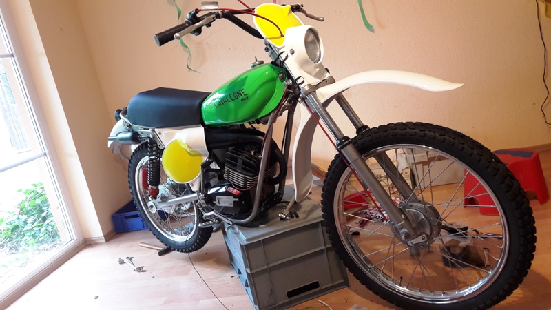 Malaguti, alte Liebe. Ich war Ronco-Fahrer, allerdings ist die Cavalcone aus den 70ern die schönste von allen - wie ich finde (hat ein wenig von Ancillotti). Nach den Aspes-Restaurationen habe ich mir meine persönliche Mala zusammengestrickt. Dabei sind Jahre ins Land gezogen. Originalteile gesucht, aber nicht Originalbaujahr und Farbe und Motor. Man möge mir verzeihen. Rahmen BJ 78 mit Ori-Gutachten ohne Vergasereintrag. Schwinge Chopper, BJ81, hatte nichts anderes. Habe ich erst beim Zusammenbau festgestellt. Zu breit – Nase für Bremsanker verlängert. Passt. War ärgerlich, auch der Auspuff hat sich gewehrt, ging aber auch dann. Stoßdämpfer alte Marzocchi (passt gar nicht in die BJ, aber schön), 6-Gang-Motor mit 70ccm und 19er, kontaktlose Zündung. Grün musste der Tank werden. Alles andere ergab sich, ein Kampf, wie sich herausstellen sollte. Letztlich wurde es der 79er Tank (zu faul, um separate Entlüftung dran zu machen), die älteren haben eine separate Entlüftung, sehen aber sonst genauso aus, die 79er Bank (habe kürzlich noch eine gaaannz seltene Ein-Mann-Sitzbank gefunden, Foto), die 78er Zwei-Mann-Sitzbank ist zu eckig für meinen Geschmack, dann bin ich von schwarzem Plastik auf weißes umgeschwenkt. Sieht besser aus. Auch die kleinen Deckel (78) sind gefälliger als die großen 79er. Kotflügel 78er mit Aprilia-Rücklicht, Maske nicht original, aber ähnlich, Licht 79er Modell (Schalter am Scheinwerfer), 78er Modell hat Aprilia-Schalter am Lenker und Aprilia-Scheinwerfer. Domino-Hebel mit Rädchen (schön, aber nicht Ori soviel ich weiß), einige NOS-Teile: Rasten, Bremshebel, Kettenspanner. Habe auch San Remo-Felgen gefunden (sehr selten). Sollten erst Akront werden. Aber seht selbst die Verwandlung. Die Kleine wird höchst wahrscheinlich Deko werden oder vielleicht im Frühjahr wachgeküsst. Zündfunke alles da. Mal sehen. Fehlen nur noch Kette und Züge. Euch was aufgefallen? Ja. Mir am Ende auch. Ich habe intuitiv die Farben der italienischen Flagge gewählt. Warum nur? Vielleicht ist sie auch ein wenig zu bunt geraten. Egal, mir gefällt´s. Ein paar unsortierte Bilder von der Entstehung.