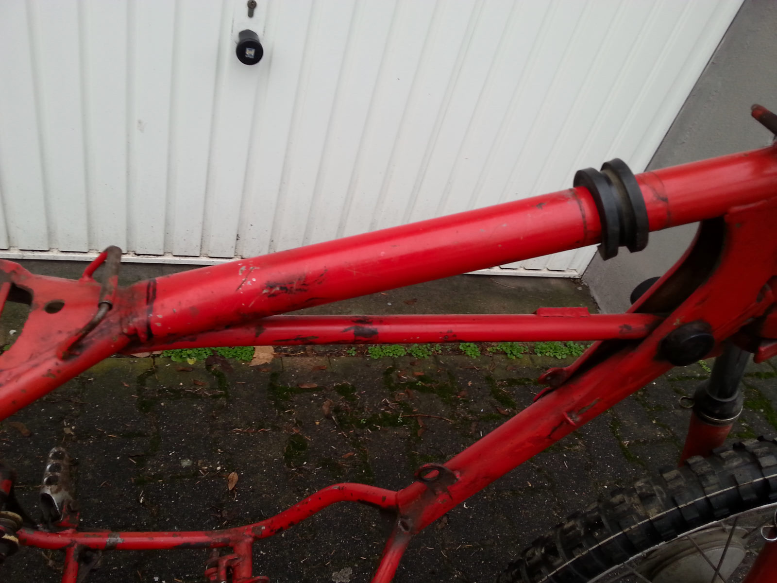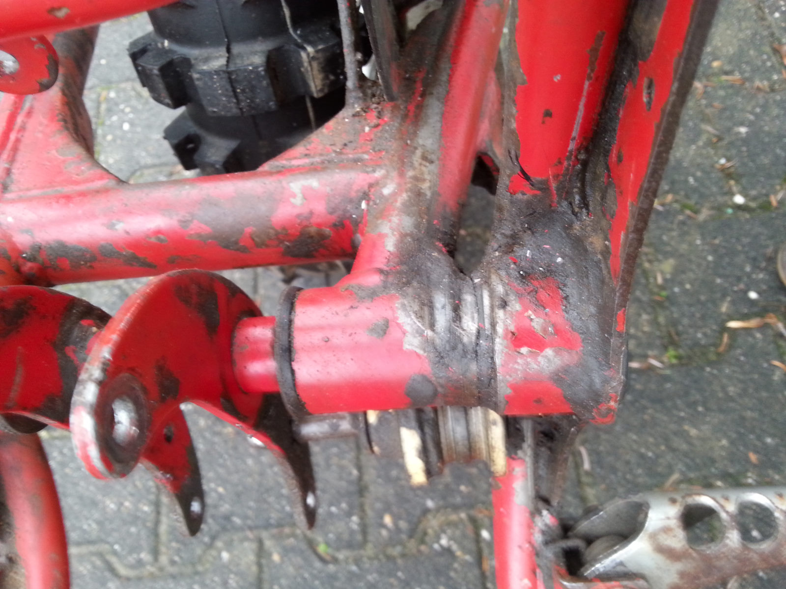 An der Schwingenachse sieht es bekanntermaßen etwas angesägt aus. warum da kein Kettenschleifer drauf ist, weiß der Henker.