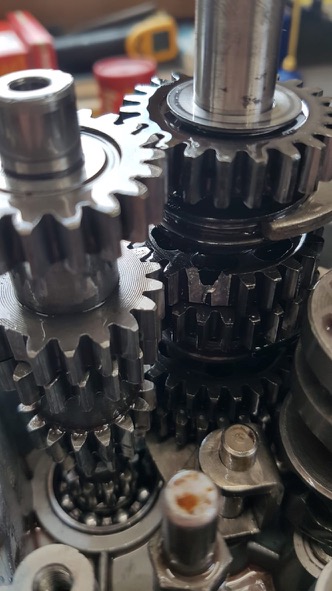 Die Schaltgabel zeigen auch nicht wirklich Verschleiß. Das würde sich ja auch eher an den Schaltklauen zeigen wenn zwei Räder minimal im Eingriff wären.