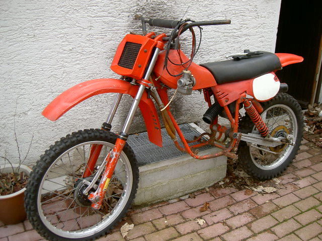 Ja genauso eine war das, Kühler anstelle Lampenmaske. Und eben nur für den Zylinderkopf. Ging wie die Hölle, die hat gedreht bis in Nirvana, und der Motor war absolut standfest. Mit entsprechenden Umdrehungen bin ich in der Kuhle wirklich jeden noch so langen Steilhang hochgekommen. Ein Morini Motor hätte sich nach 10 Minuten festgefressen. Und komplett rot. Ansonsten die klassische Aprilia Linie. Kastenschwinge mit Marzocchi Gasdruck Stoßdämpfern, die hatten aber schon geölt. Ich habe es aber geschafft, die gegen die sehr hochwertigen Dämpfer einer Kreidler Van Veen zu tauschen mit gelben zweigeteilten Federn. Die Van Veen gab es damals recht günstig, weil die KKR Versicherung so teuer war. Vor dem Verkauf habe ich die aber an meine Malaguti Cavalcone gebaut, ebenso die Seitenteile (hab die ohne Seitenteile weitergegeben). Und die Cavalcone hatte Gabel, Schwinge und vorderen Kotflügel von einer TGM 80 + 6 Gang Motor mit dem kompletten Tuningpaket, was der Morini Baukasten so hergab (Zylinder + -kopf, Rennauspuff, 19er Dellorto).