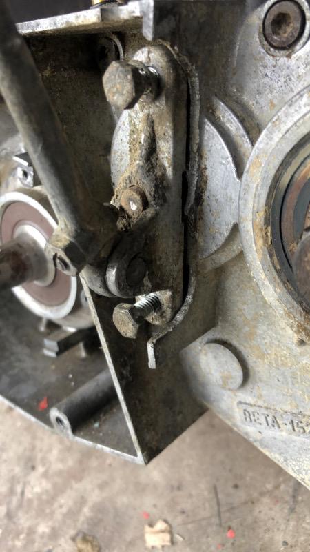 Hier sieht man den „Halter“ für den Ausrückmechanismus und da wo die Schrauben sind, muss du eben unten 1-2 mm wegfräsen/feilen (soviel wie der L-Winkel halt dick ist) und dann da die „Ohren“ des L-Winkel unterlegen. Die Höhe des Ausrückmechanismus bleibt damit ja wieder wie vorher.