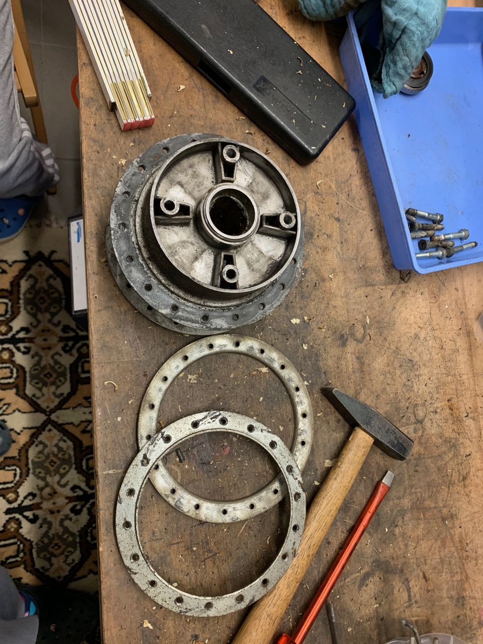 Irgendwann hatte ich dann alles zum Einspeichen und Zentrieren beisammen , Speichen mit Nippel, gestrahlte Naben mit neuen Lagern und Bremsbelägen, verzinkte Nabenringe und neue Felgen, dann ging es Samstags gut gelaunt zum Kalle.