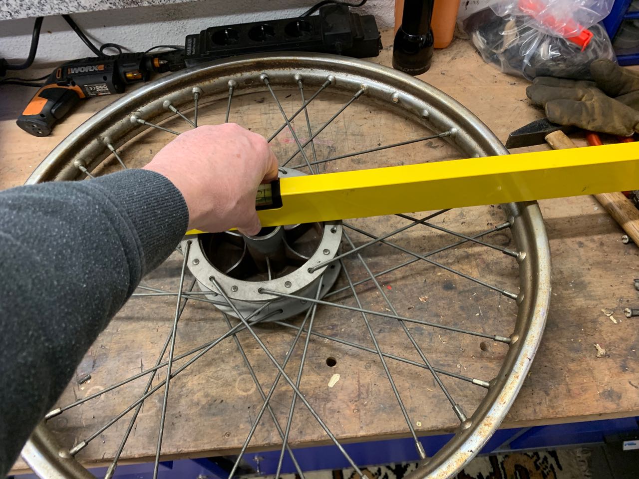 Nachdem Kalle mir den Speichen Workshop bei sich angeboten hatte, musste ich mich dann vor dem Zerlegen der Felgen erst mal mit seinem Zentrier Beitrag auseinandersetzen und die notwendigen Messungen mit Fotos machen, damit die Felgen auch dann später vernünftig laufen.