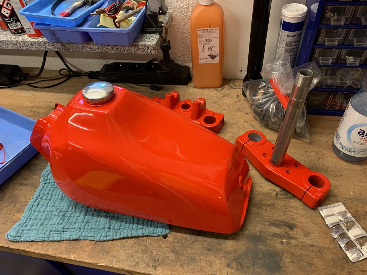 Beide Felgen waren nun endlich fertig, Metzeler Six Days mit Schläuchen bestellt, die Reifen sind zwar etwas overstyled, aber der Reifen gefällt mir optisch besser als der Conti , zumal auf der Cimatti früher richtig grobstollige Pirelli`s verbaut waren, die es heute leider nicht mehr gibt.