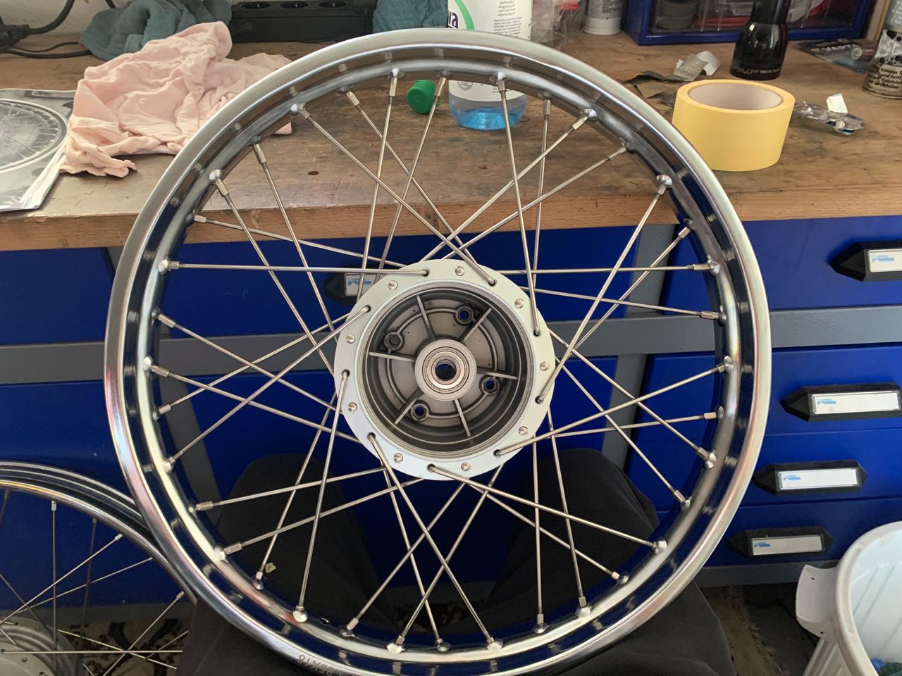 Beide Felgen waren nun endlich fertig, Metzeler Six Days mit Schläuchen bestellt, die Reifen sind zwar etwas overstyled, aber der Reifen gefällt mir optisch besser als der Conti , zumal auf der Cimatti früher richtig grobstollige Pirelli`s verbaut waren, die es heute leider nicht mehr gibt.