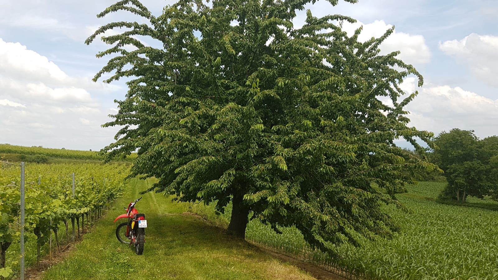 Je nach geplanter Tour, wähle ich die Übersetzung. Von 12 bis 15 Zähnen hab ich die Auswahl und in 5 Minuten ist das Ritzel gewechselt. Gestern ging es erstmal quer durch Freiburg aufs Land. Dementsprechend war das 15er Ritzel drauf. Nicht so lustig beim Stop an Go, aber klasse auf der Ebene. Ziel waren die Rebberge des Tunibergs, wo ein Kirschbaum meiner Patentante auf meine Besteigung gewartet hat.