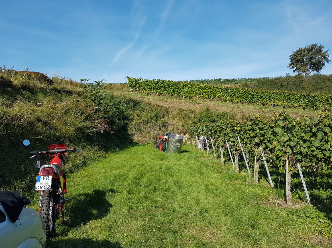 Noch vor wenigen Jahren war das im ganzen Weinberg so. Man hörte das Tratschen und Lachen der Familien rechts und links, die gemeinsam gearbeitet haben. Mittlerweile ist es aber recht ruhig geworden. Der Vollernter auf einem Nachbarstück leutet auch hier eine Zeintenwende ein.
