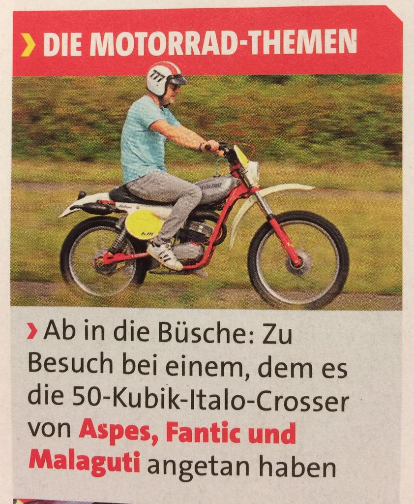 ) Titelbild ist auch immer ein Auto. Beide waren sehr angetan von meiner Fantic Replica, das war eigentlich der Auslöser für den zweiten Artikel, da es sich aber immer um eine Restaurierungsstory handeln muss war dann die Malaguti der Aufhänger, die Replica hab ich ja fertig gekauft, die Aspes ebenfalls. Die haben wir dann beide dazugestellt. Ergibt ne tolle Story